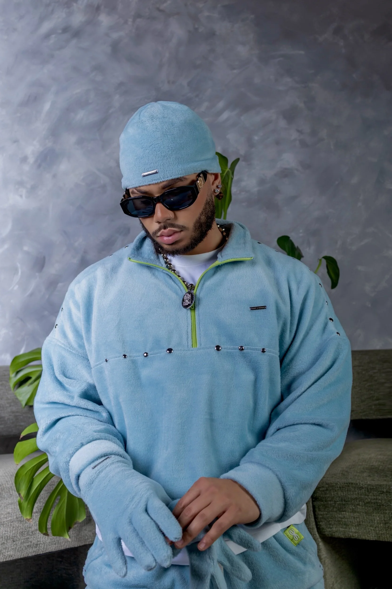 A light blue quarter-zip jacket is complemented by matching detachable gloves, creating a cohesive and stylish ensemble. The jacket features metal chrome rivets, adding a touch of sophistication.